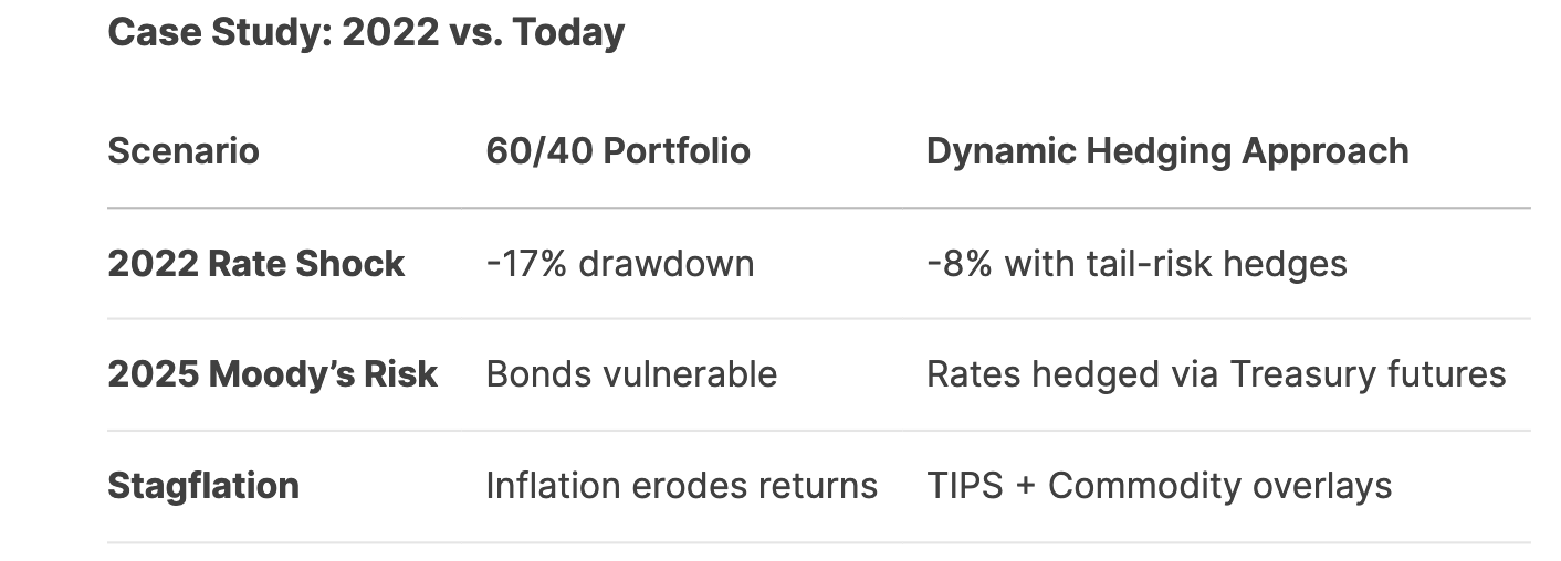 The 60/40 is not dead—but it’s dangerously incomplete. With Moody’s downgrade amplifying macro risks, advisors should consider adopting dynamic hedging to: